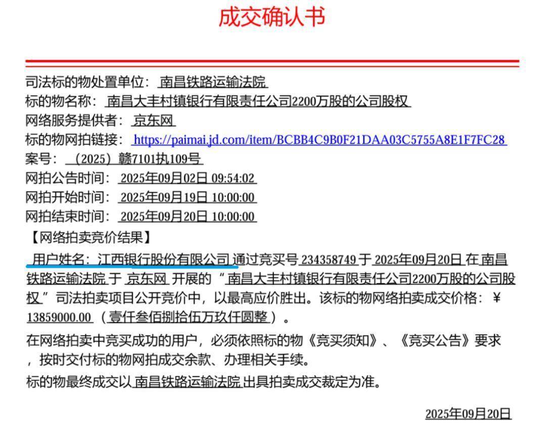 9月20日,在京东司法拍卖平台上,江西银行以1385.90万元竞得南昌大丰村镇银行2200万股股权。